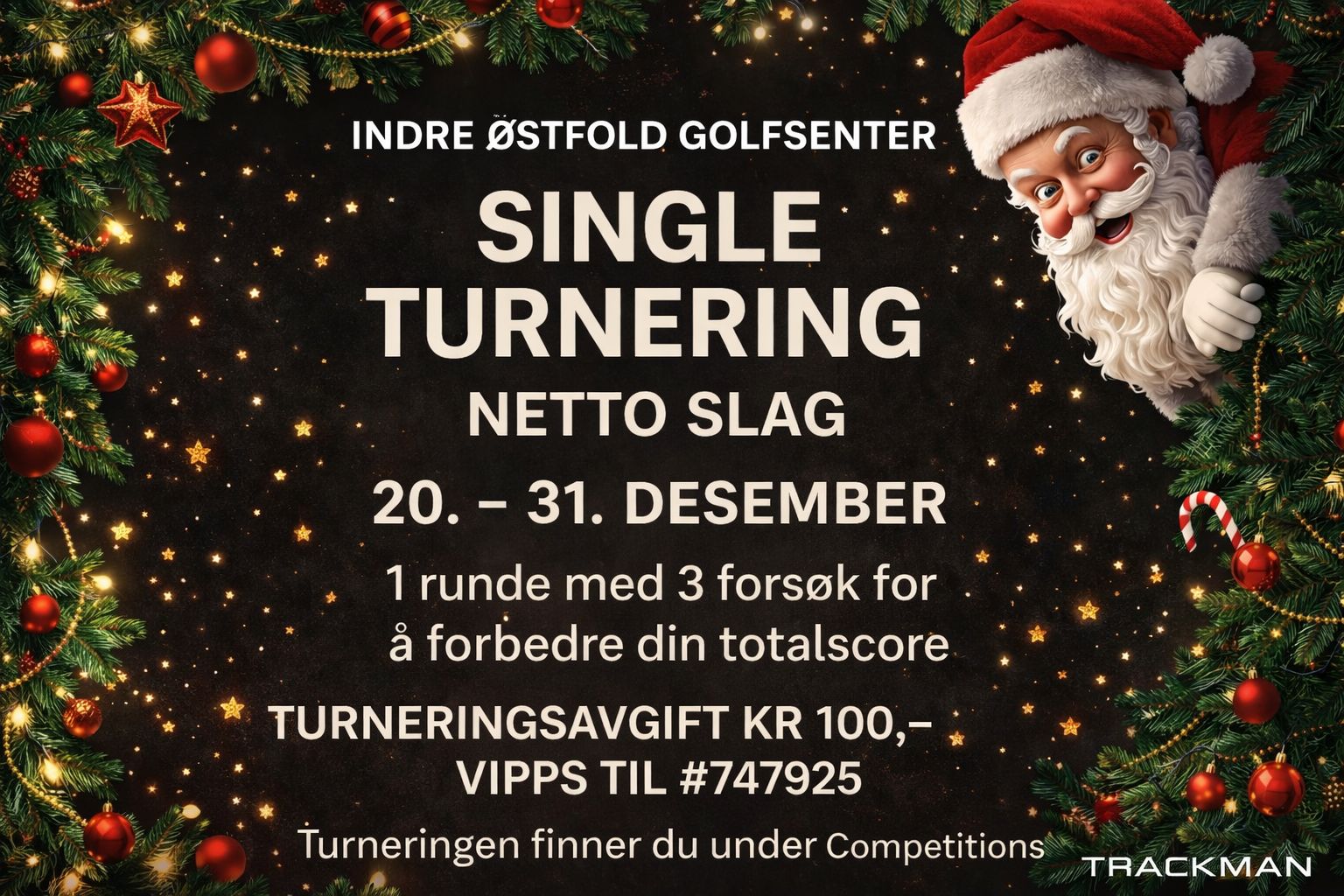 Turnering kan spilles når som helst i perioden 20.- 31.desember. Spilleform er netto slag med innlagt closest to pin og longest drive konkurranse. Turneringen går over 1 runde, men du har 3 forsøk. Det betyr at du kan spille samme runde inntil 3 ganger og din beste totalscore blir din tellende score. Du trenger ikke ta alle forsøkene samme dag.